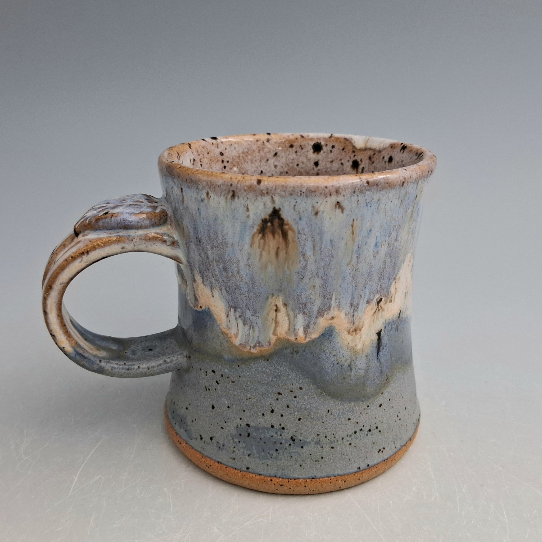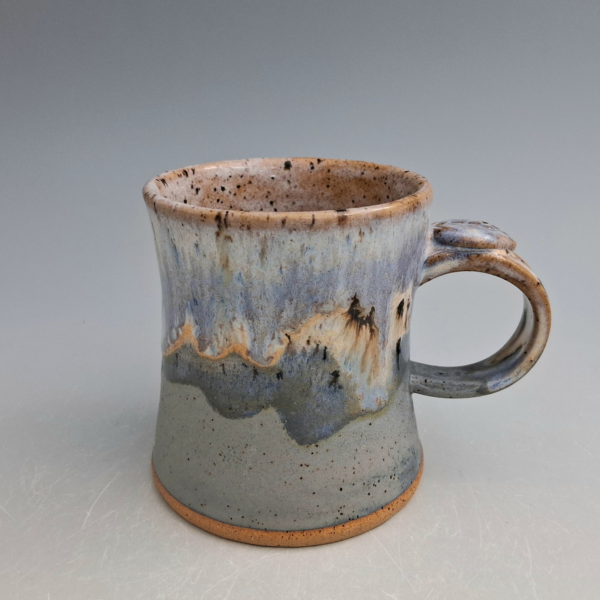 The glaze on this mug is speckled cream with periwinkle and blue.