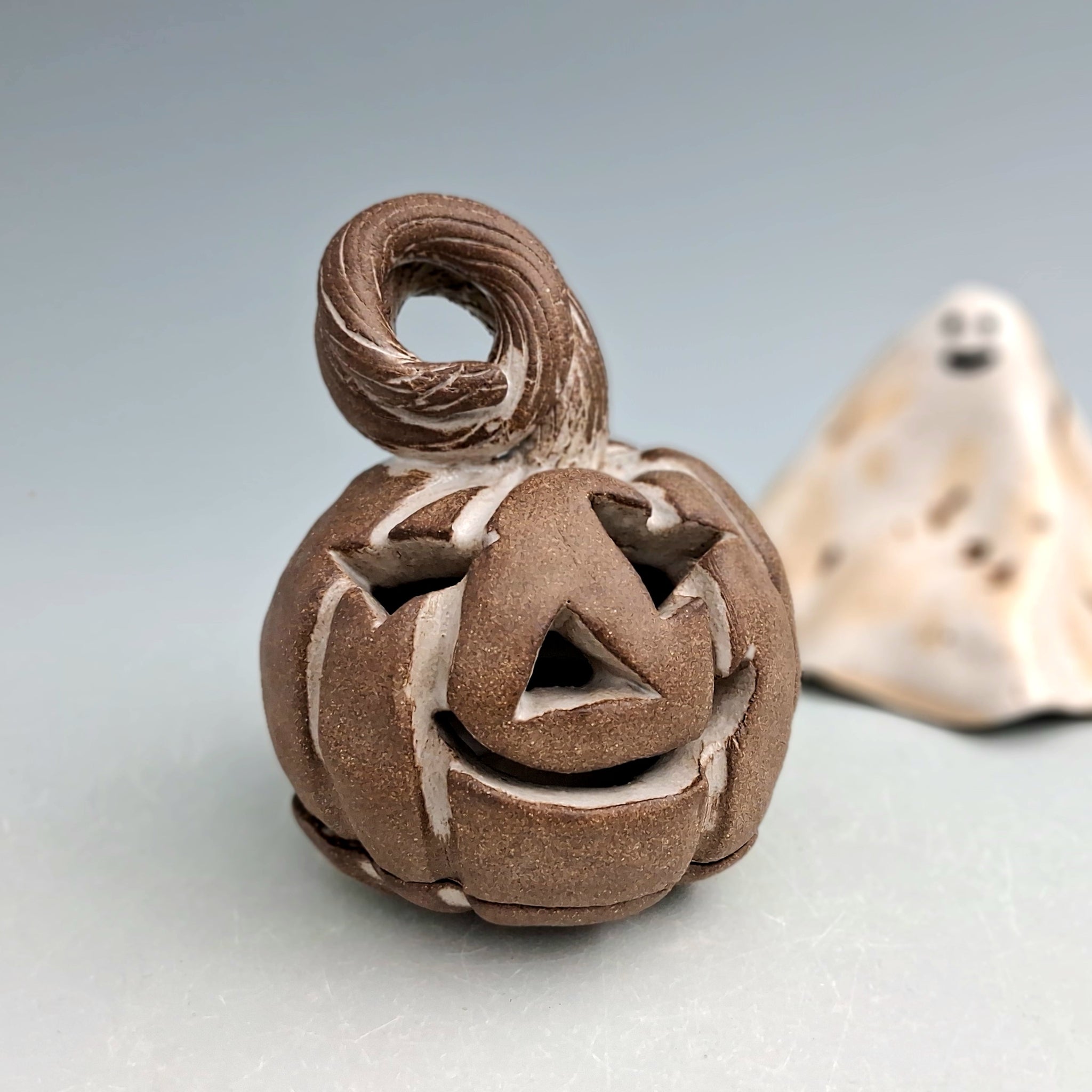 This little carved pumpkin has a separate bottom for a tealight. Constant supervision should be used as with any lit candle.The unglazed sections reveal the raw chestnut clay.
